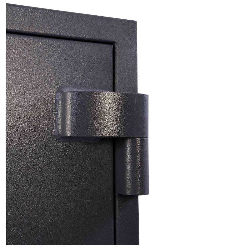 ― огнестойкость класса LFS 30P по евростандарту EN 15969, обеспечивающая гарантию защиты денежных знаков и документов от доступа огня не менее получаса при 1000°C (в реальных условиях подобная температура при возгорании не достигается). - Дверь на мощных внешних петлях раскрывается на 180 градусов. Её конструкция содержит ряд специальных технологических решений, направленных на защиту от выдавливания гидравлическим устройством, выбивания, распиливания петель, вырезания замков и иных способов повреждения.
