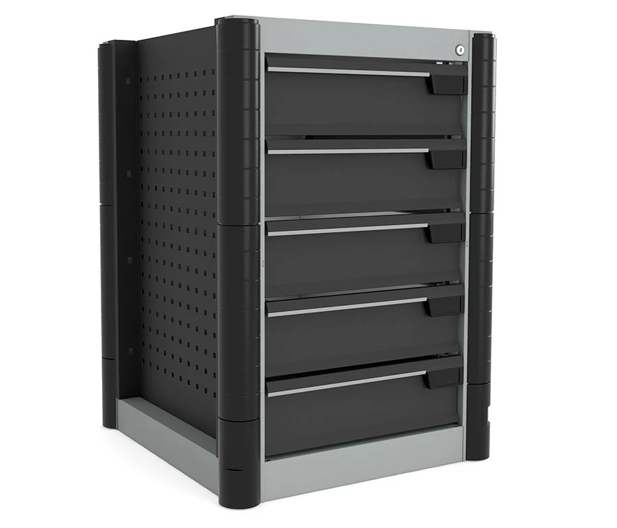 - Боковые стенки тумбочек имеют перфорированный профиль, на котором удобно размещать верстачные аксессуары.
